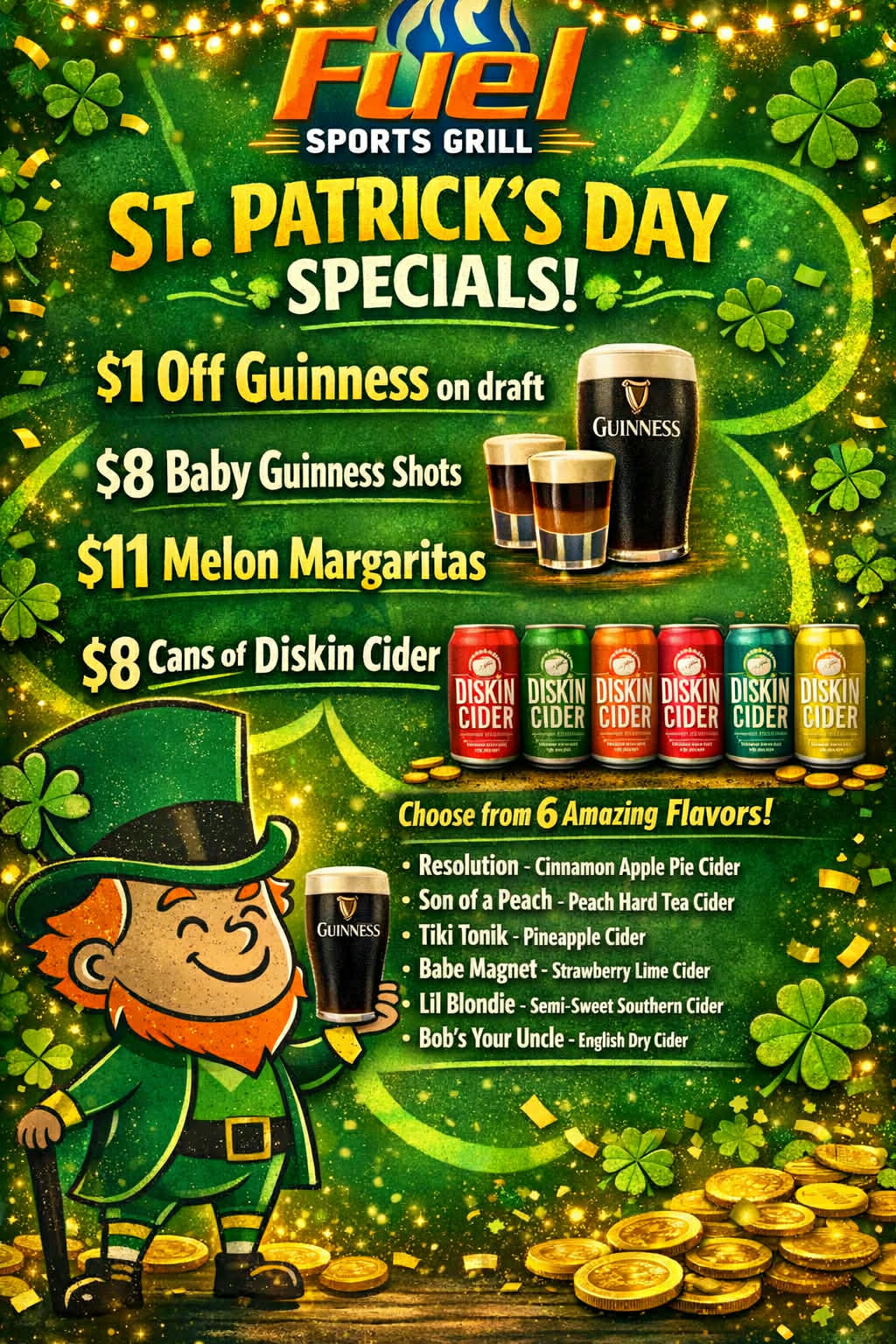 Come find your pot of gold (or at least a great buzz) at Fuel Sports Grill. Sláinte to good times, great friends, and zero regrets!